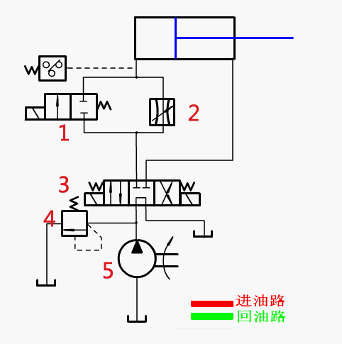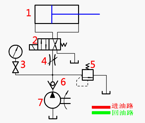 油路說明:在進(jìn)油管路上設(shè)置節(jié)流閥,控制液壓油流量,進(jìn)而控制活塞桿移動速度