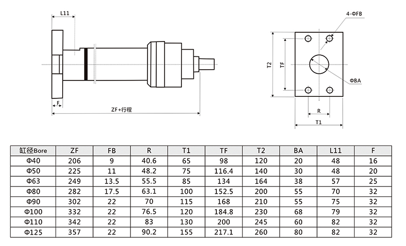 冶金液壓缸尾部長方法蘭外形安裝尺寸圖