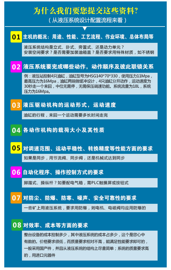 做一臺(tái)液壓系統(tǒng)需要客戶提供液壓要達(dá)到什么樣的功能要求。液壓系統(tǒng)的整個(gè)工作過程。比如一共有幾個(gè)油缸或馬達(dá),每個(gè)油缸需要達(dá)到多少推力,每個(gè)油缸的速度是多少是否有變化,以及每個(gè)油缸的負(fù)載情況。多個(gè)油缸時(shí),是否有同時(shí)工作或同步要求。(是否變化、還需要提供工作時(shí)間、工作環(huán)境)