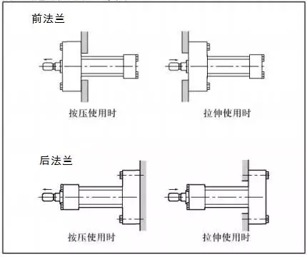 ?。?)法蘭安裝適合于液壓缸工作過程中固定式安裝,其作用力與支承中心處于同一軸線的工況;其安裝方式選擇位置有端部、中部或尾部三種,如何選擇取決作用于負(fù)載的主要作用力對(duì)活塞桿造成壓縮(推)應(yīng)力、還是拉伸(拉)應(yīng)力,一般壓縮(推)應(yīng)力采用尾部、中部法蘭安裝,拉伸(拉)應(yīng)力采用端部、中部法蘭安裝,確定采用端部、中部或尾部法蘭安裝需同時(shí)結(jié)合系統(tǒng)總體結(jié)構(gòu)設(shè)計(jì)要求和長(zhǎng)行程壓縮(推)力工況的液壓缸彎曲穩(wěn)定性確定。